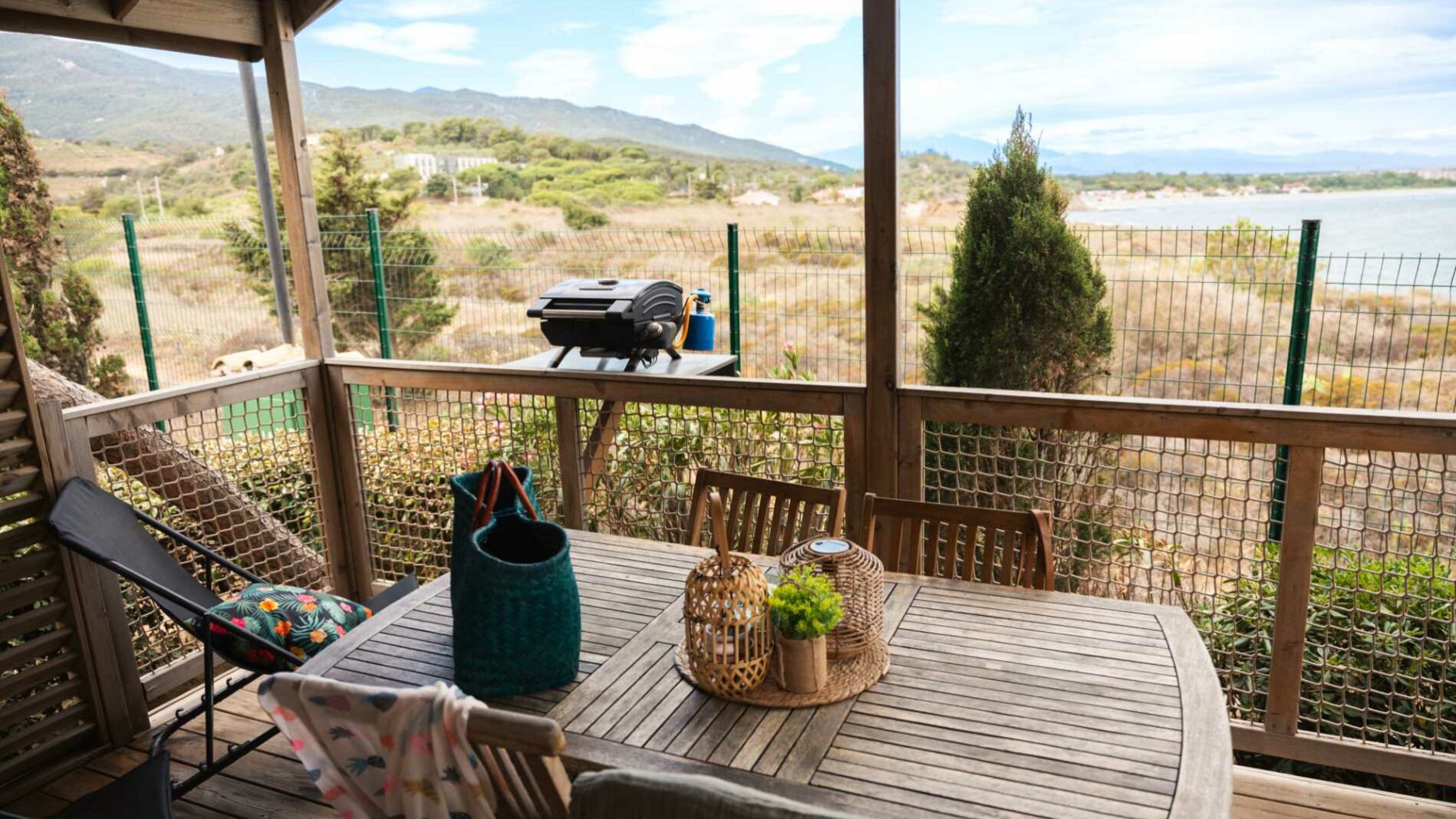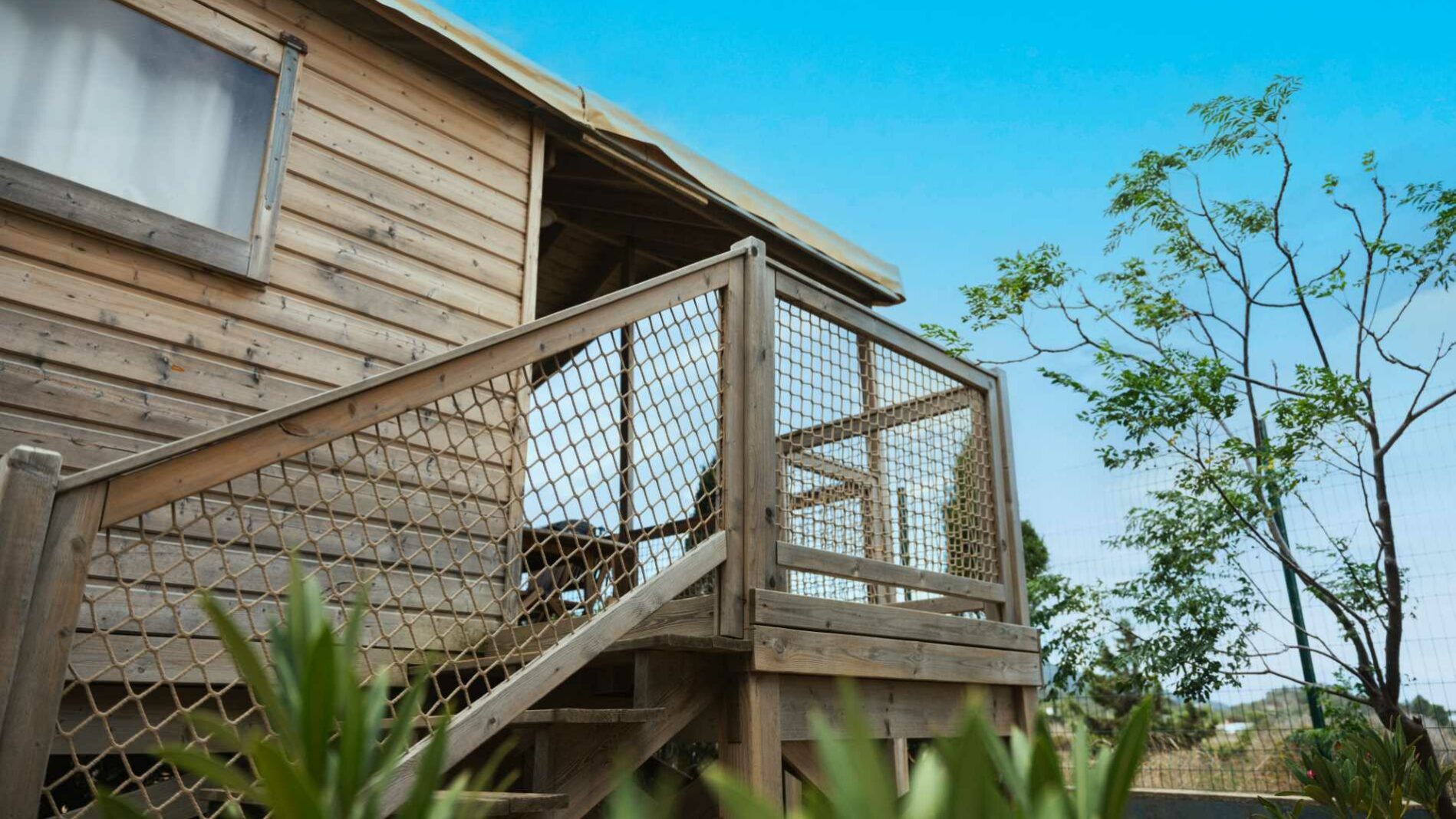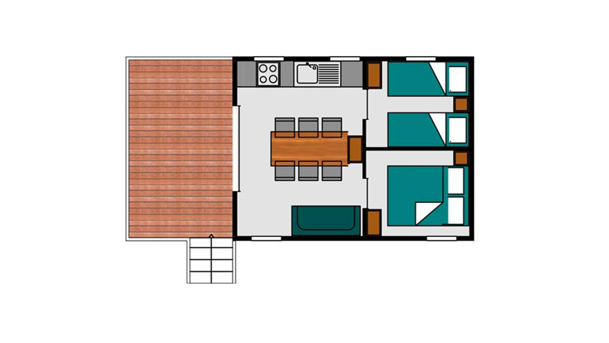 24m² + 10 m² Overdekt terras. een slaapkamer met 1 tweepersoonsbed (140×190), een slaapkamer met 2 eenpersoonsbedden (80×190), een zithoek met slaapbank voor 2 personen (140×190). Compleet ingerichte keuken. Houten tuinset.