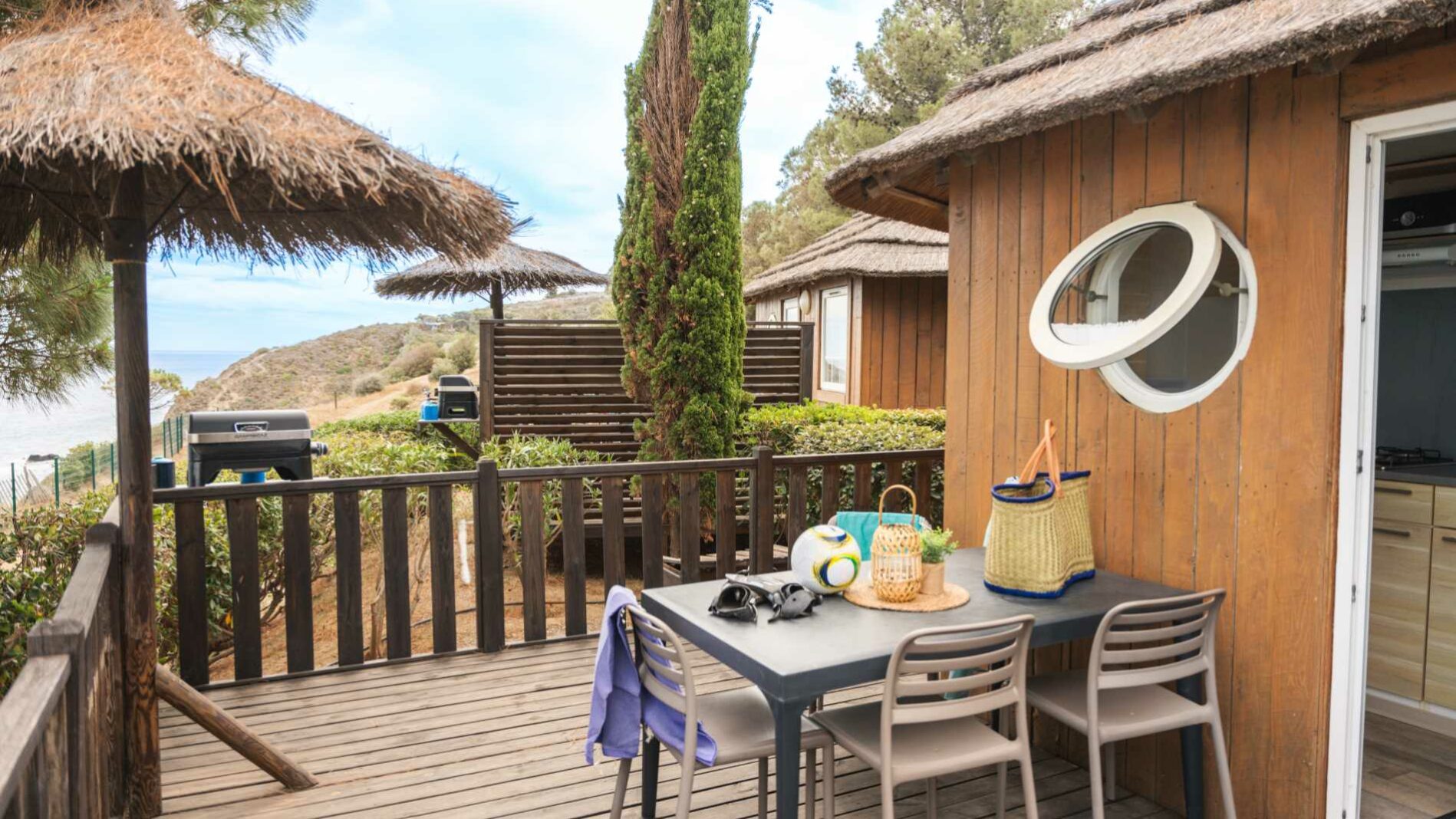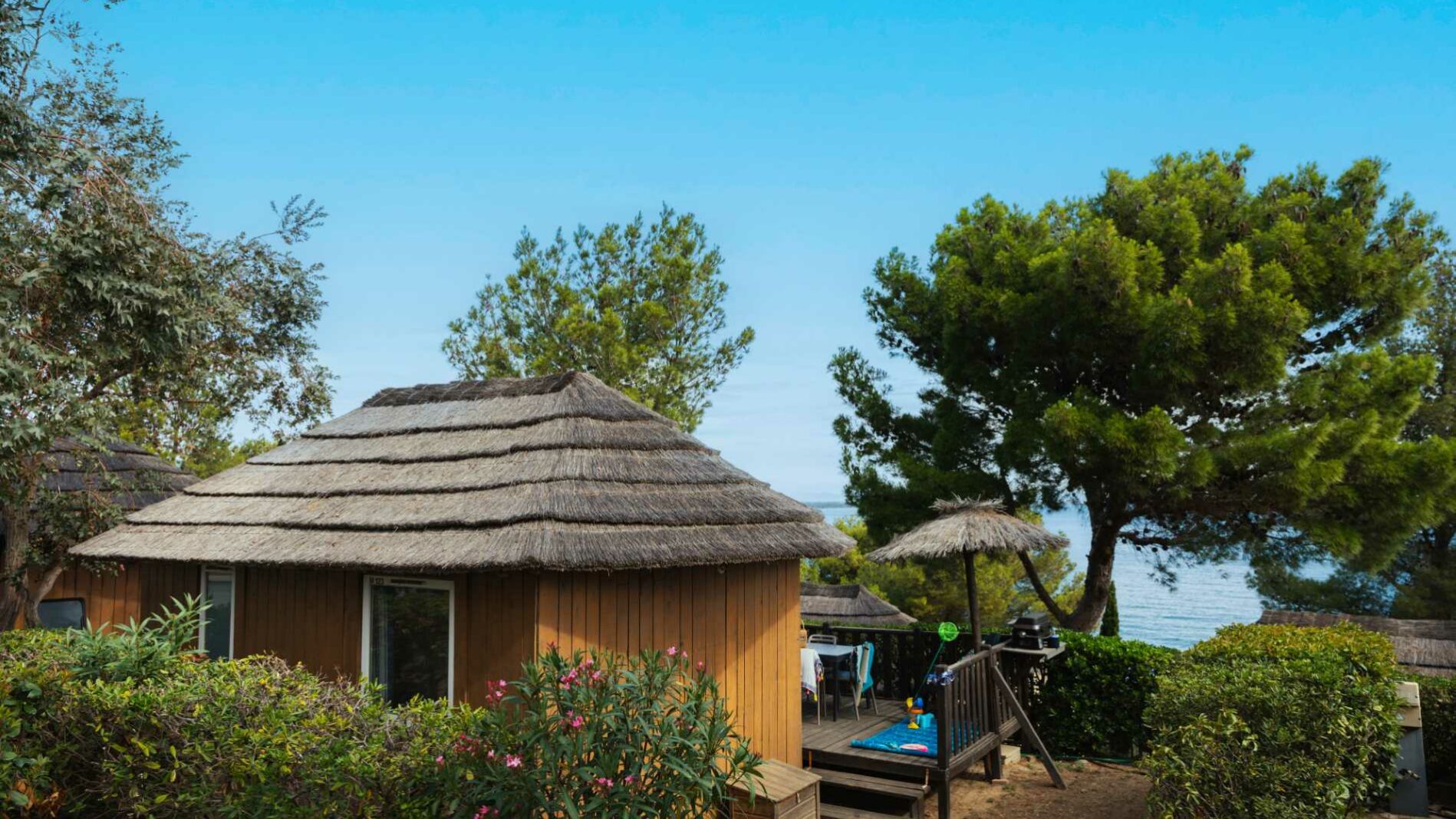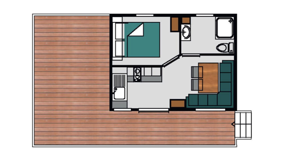 Het comfort van een mobile home in een cottage van 20 m². Een slaapkamer met een bed (160 x 200). Een zithoek om te bouwen tot een tweepersoonsbed (140 x 190). Een volledig ingerichte keuken. Een badkamer met een wasbak, douche en wc. Een op maat gemaakt terras variërend van 15² tot 22m² met een tuinset en vaste parasol.