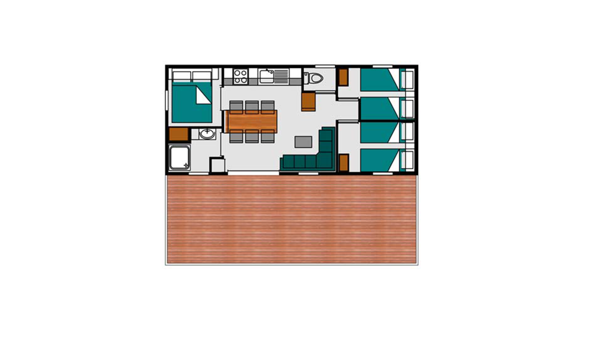 34m² + 20m² Overdekt terras, een slaapkamer met tweepersoonsbed (160 x 200), twee slaapkamers met 2 eenpersoonsbedden (80 x 190), eet/woon hoek, ruime compleet ingerichte keuken met keukeneiland. Badkamer met XXL-douche (100 x 80), wasbak, 1 aparte wc. Tuinset.